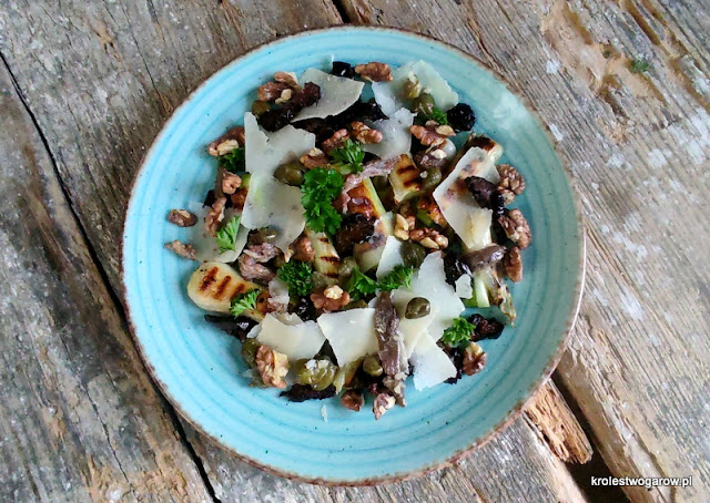 Grillowane pory z kaparami, orzechami włoskimi, śliwkami wędzonymi i parmezanem. Grillowane pory można podawać do steków, piersi kurczaka, wędzonego tofu, filetów pstrąga.